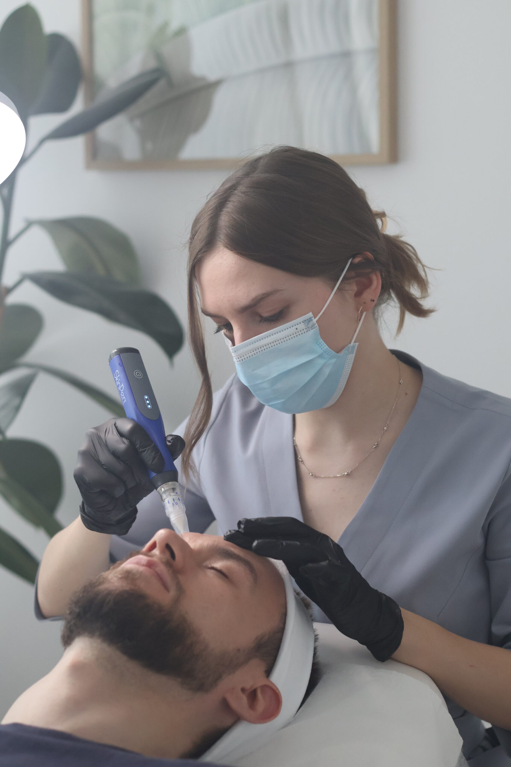 Zabieg mezoterapii mikroigłowej wykorzystujący technikę nakłuwania medycznym sprzętem Skinpen Precision®.